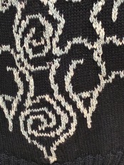 アイヌ服飾研究家 津田命子さんデザインのアイヌ文様を全面に編み込んだウールとシルクのマフラーです。端はゴム編みで、ダブルで輪になっており裏側は無地の紺色になっています。ダイナッミクな文様が首回りを守ってくれるようです。