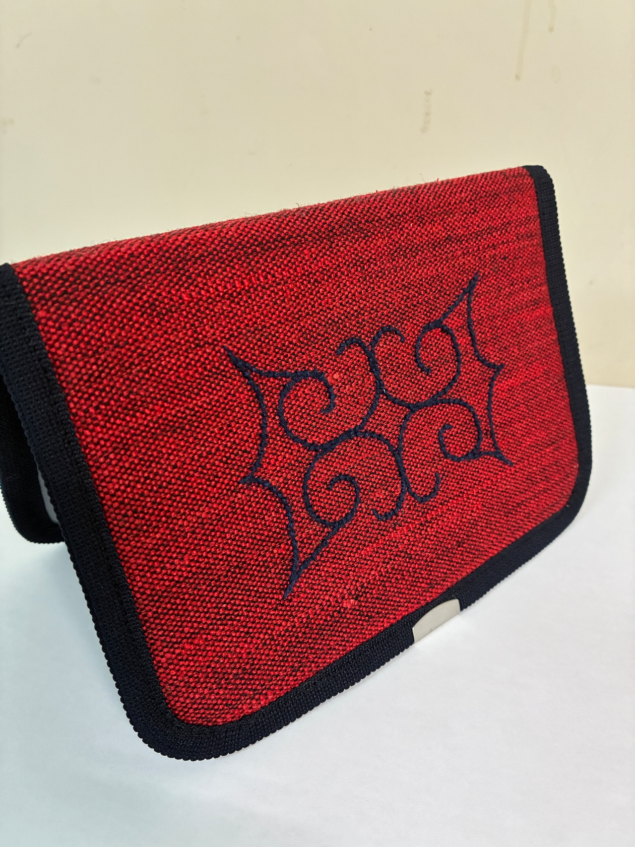 アイヌ服飾研究家 津田命子さんデザインのアイヌ文様の刺繍をしました。土台の生地は帯地をつかいました。綿100%、まわりのリボンテープもしっかりとしたものを使っています。