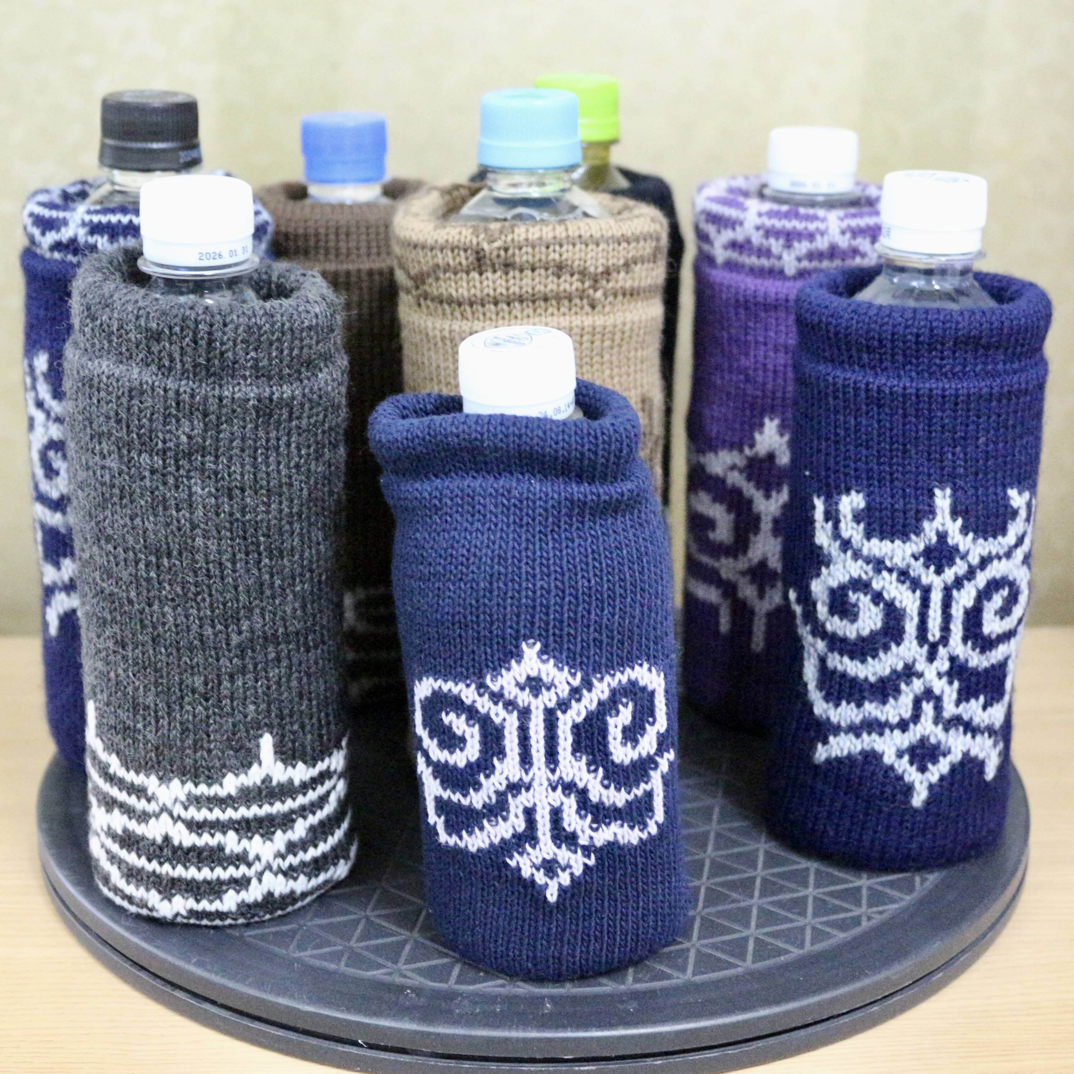 アイヌ服飾研究家 津田命子さんデザインのアイヌ文様を編み込んだペットボトルサイズのボトルカバーです。